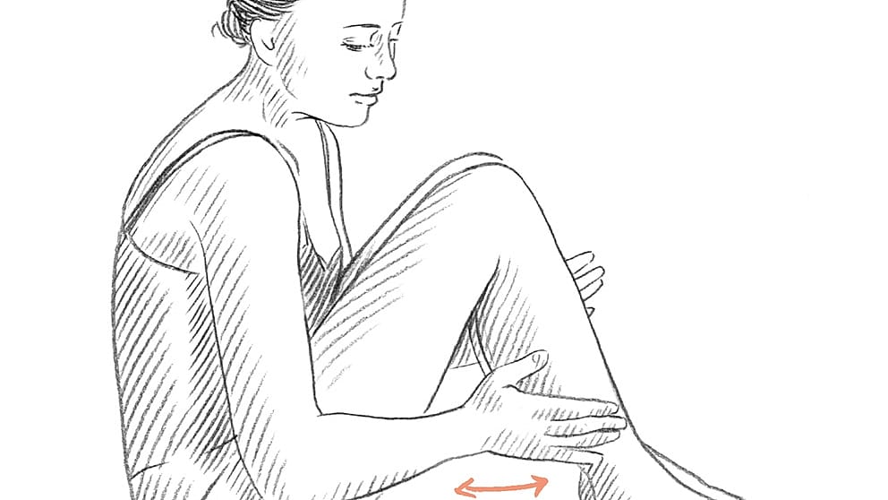 Step 1: While seated on the floor, place your foot close to your body. Elevate the ball of the foot on a rolled-up towel, for example, to stretch the Achilles tendon.